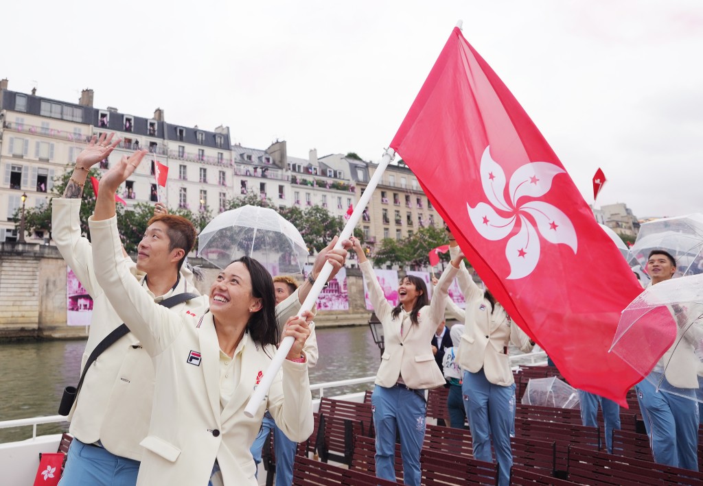 ▲何诗蓓(前排右)及张家朗(前排左)担任今届奥运港队持旗手。 新华社