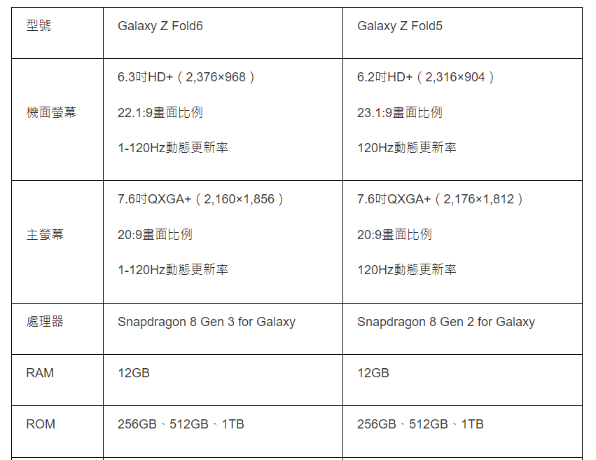 Galaxy Z Fold6 Vs. Fold5规格比较