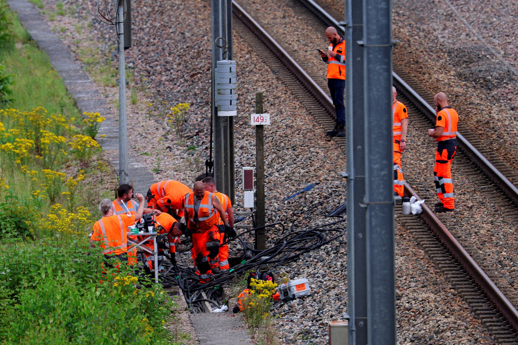 ▲巴黎奥运26日开幕前几小时,法国高铁多条路线遭到纵火、破坏,法国29日表示,倾向认定极左翼极端分子是幕后凶手。图为法国国家铁路公司人员及执法人员27日抢修遭到破坏的铁路路段。 (路透社)