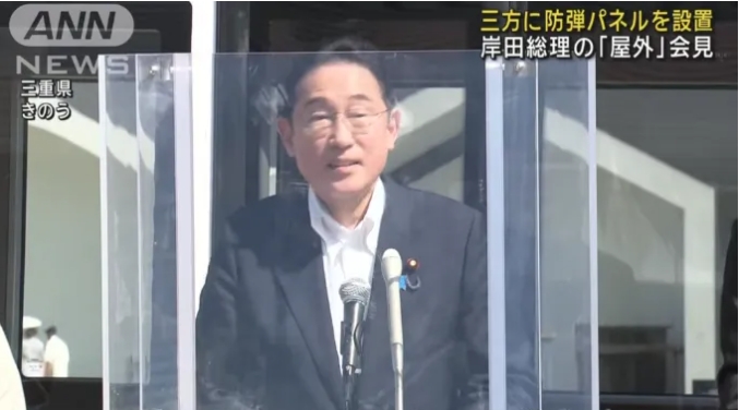 ▲据日媒报道,日本首相岸田文雄7月31日下午在三重县举行室外记者会时,他讲台的前面和左右已竖起防弹玻璃以为他提供防护。 日媒