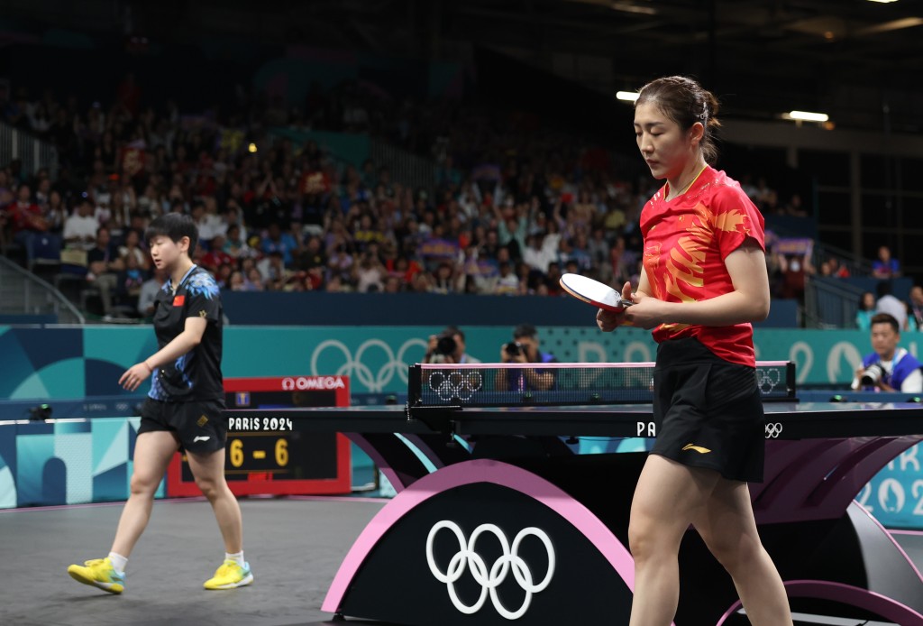 ▲巴黎奥运乒乓球女单决赛,陈梦(红衫)击败孙颖莎。 新华社