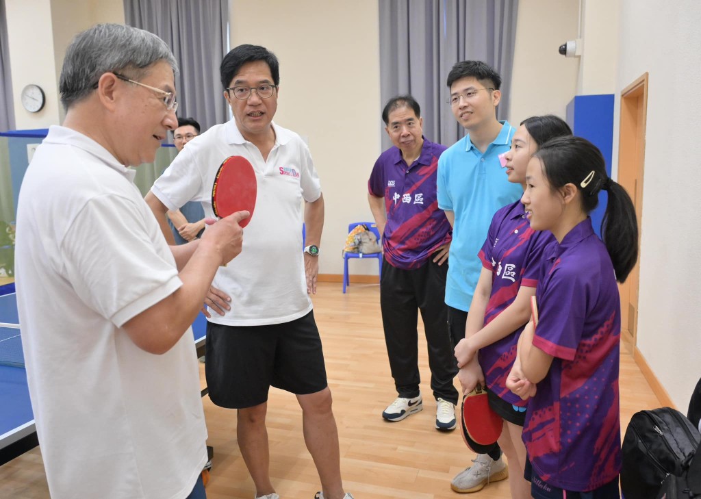 财政司副司长黄伟纶则联同政务司副司长卓永兴到石塘咀体育馆,齐齐参与“全民运动日”,并观看运动示范,尝试跟教练指示玩足毽,原来要练好足毽基本功,一点也不容易。两位副司长其后分别伙拍中西区乒乓球小运动员谭芯宇及谭亦孜,打了局乒乓球,大家球来球往,乐在其中。