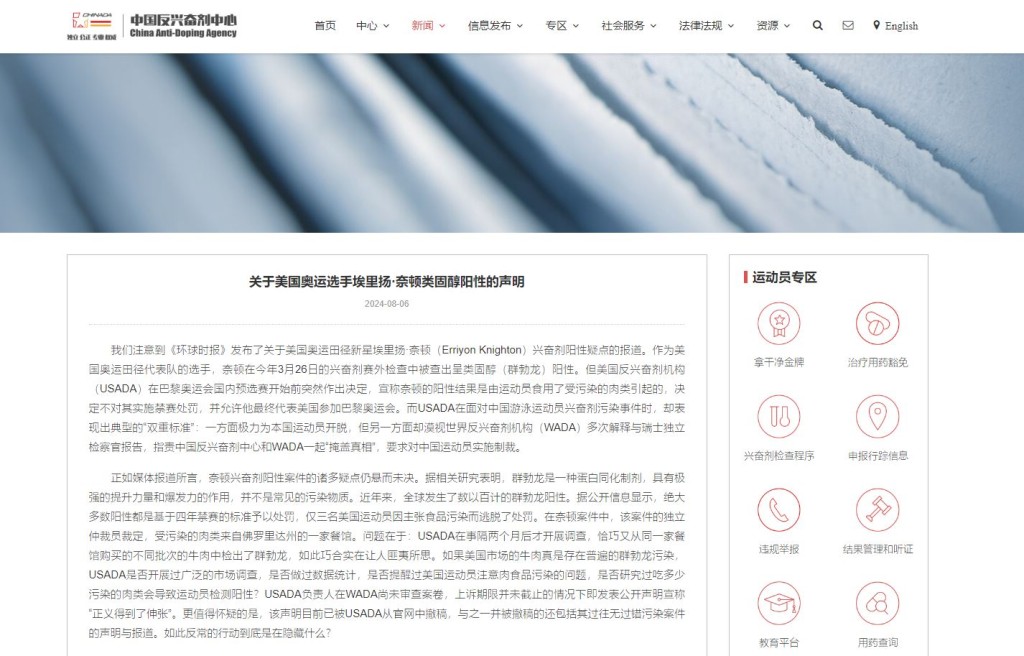 声明批评,美国国会、反兴奋剂机构、媒体在中国游泳运动员食品污染案件上故意选择性失明失聪,图混淆是非让国际社会与民众产生错误认知,并藉此将反兴奋剂问题政治化,鼓动美国司法部和联邦调查局动用国内司法和政治手段进行调查,发起对该事件的“长臂管辖”。