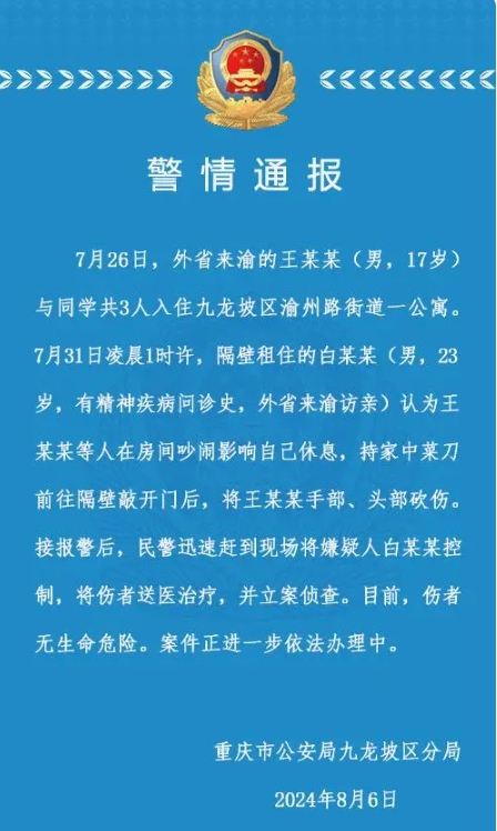 首页>内地>社会 17岁学生旅游在酒店遭砍伤?重庆警方:嫌疑人有精神病问诊史 发布时间:2024-08-07 11:31 重庆市公安局九龙坡区分局8月7日通报,7月26日,外省来渝的王某某(男,17岁)与同学共3人入住九龙坡区渝州路街道一公寓。7月31日凌晨1时许,隔壁租住的白某某(男,23岁,有精神疾病问诊史,外省来渝访亲)认为王某某等人在房间吵闹影响自己休息,持家中菜刀前往隔壁敲开门后,将王某某手部、头部砍伤。接报警后,民警迅速赶到现场将嫌疑人白某某控制,将伤者送医治疗,并立案侦查。目前,伤者无生命危险。案件正进一步依法办理中。 ▲重庆市公安局九龙坡区分局发布通报。 来源:重庆市公安局九龙坡区分局 相关阅读 专题 更多 > 中芯国际上半年营收预计超22亿美元,四季度将试产7nm工艺 太兴盈喜料多赚逾3倍,指将坚守审慎理财政策 中国移动半年多赚5%,中期息增近6% 清华女学霸创业、一年一融资,镁佳股份估值9.3亿美元冲刺港交所 应收账款走高,丰沃股份三成收入打“白条” 惠科股份IPO:获政府补助超53亿,向实控人堂弟采购超8亿 关税战|白宫:特朗普签行政命令,对华关税暂缓期再延长90日 高盛:64%关税成本由美企“买单”,消费者仅承担22% 美媒:特朗普政府通过关税施压,要求买美国军火 热门文章 美国美女教师激战11岁男学生,私生子长相揭发惊人真相 妹子遭“黄痰、鼻涕”抹下体超崩溃,男友只喊这句话 大罢免朱立伦竟出这高招,郭正亮曝结局:民进党至少倒5个 新疆女生长相神似“张曼玉”爆红,本人羞回:做梦都会笑醒 奇闻秘史︱清朝22岁最后武状元,凭“执生”赢光绪欢心霍元甲都认输 特朗普1月20日上任美国总统,就职典礼8大重点率先看 蔡壁如选民众党主席有赢面?媒体揭3动机博声量最大化 你是否赞成台湾执行死刑?最新网络民调太震撼网友一面倒 看到柯建铭近日举动,沈富雄示警:没有处理是空前大危机 万千星辉颁奖典礼2024丨年度最高点击剧集片段头5位出炉