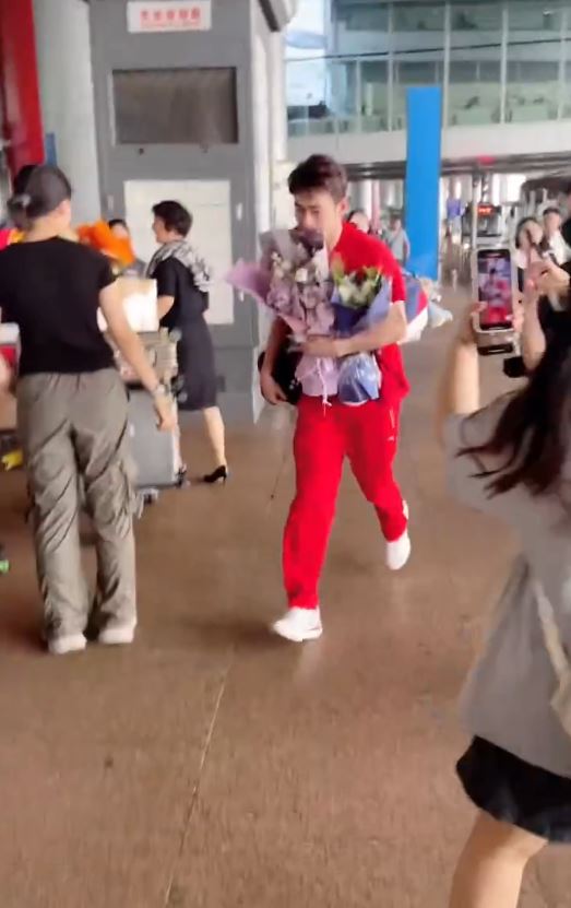 巴黎奥运羽毛球男双金牌战后,内地男子羽毛球手王昶因帅气外型和自在打球态度吸粉无数。近日他搭机回国,一出机场就被大量女粉丝举着手机围堵狂追,手捧几束鲜花的王昶一路狂奔突围。