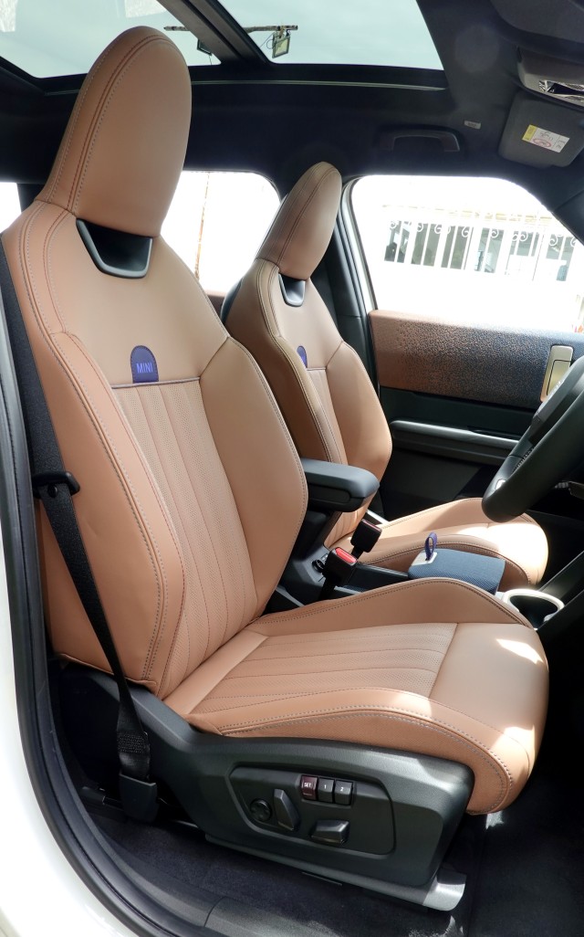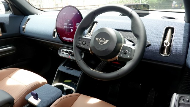 新款Countryman讲究绿色环保,车厢四周及中控台皆以针织布艺为主调,前排门壁用上渐变色编排悦目,两排座椅採用Vecsin人造皮革包装乘坐感觉软滑贴服,豪华版的前座席为专属JCW跑车桶座椅附电控调校、驾驶席另备记忆及按摩功能;后排平地台设计予乘客倍感空间宽敞,后座椅背备4/2/4式手动收摺,让原有450公升车尾厢可因应需要扩展至1,450公升存量,足以摆放多件大型行李箱。新车另一焦点莫过中控台上方直径达240mm的圆形OLED触控屏幕,内置最新MINI OS.9应用程式连语音导航系统;标准装备还包括投射表板、双区式恆温冷气连后排独立送风、后泊镜头附自动泊车辅助、手机无线充电器、全景式玻璃天窗附遮阳帘、电尾门开关、前后4组Type-C插口及12V插座等。