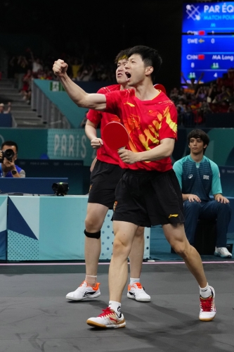 ▲国乒老大哥马龙出战巴黎奥运男子团体决赛。 AP
