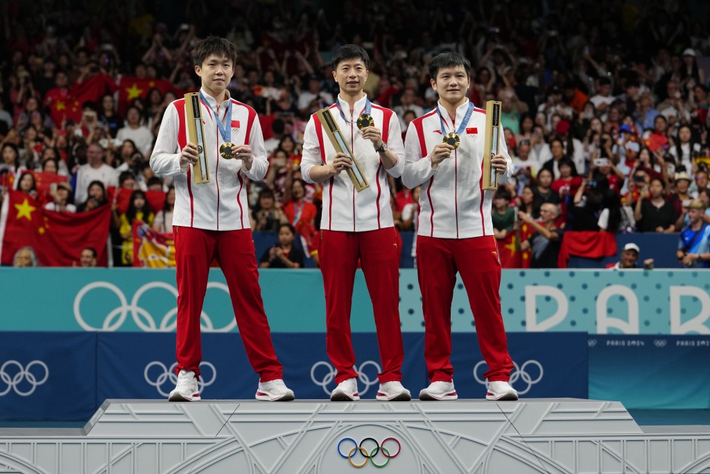 ▲马龙(中)是“超级全满贯”男子乒乓运动员,被封“国乒一哥”。AP