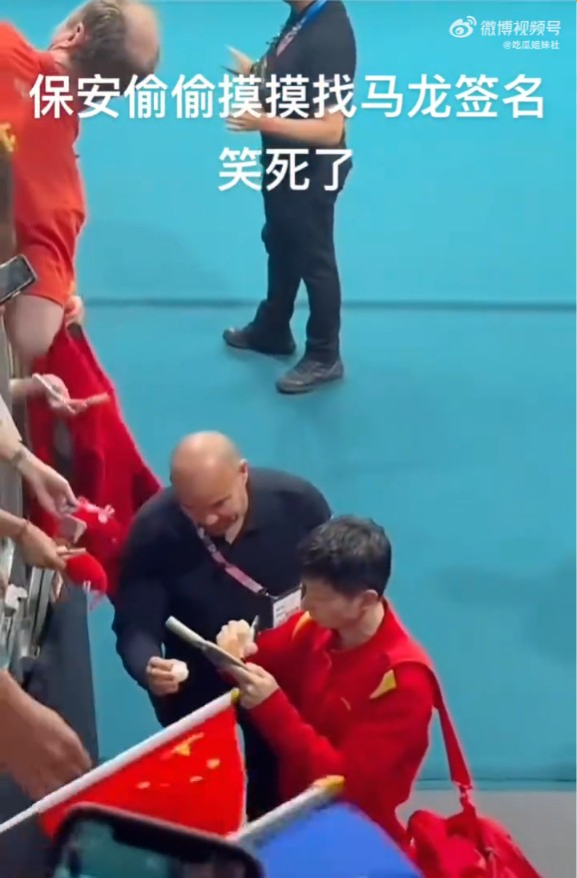 被热情球迷叫停的马龙,亦相当识做,留步为球迷签名,在场馆近出口位置开了一个小型签名会。影片在微博疯传,网民除了赞叹马龙的人气,亦留意到场内一名外籍男保安悄悄走到马龙身边求签名的举动,话题“保安偷偷找马龙签名”即冲上热搜榜。影片可见,马龙离场时走近观众席签名,一名外籍男保安表现严肃地走近马龙,本以为他为顾马龙安全,上前保护马龙,但他却笑着从裤袋中拿出一个乒乓球,递给马龙希望对方签名。马龙友善为该保安签名后,对方回到工作岗位,开心得向同事作状地挥拳,可见他表现出作为球迷的兴奋心情。网民都笑指马龙魅力大,亦对健硕保安的反差感觉得可爱。