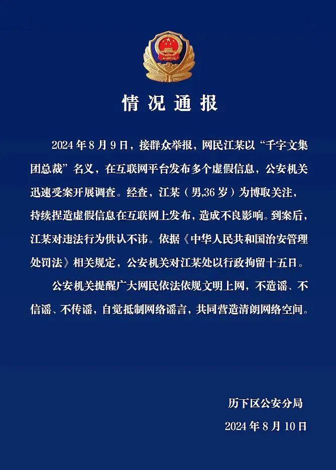 山东济南历下公安分局表示:2024年8月9日,接群众举报,网民江某以“千字文集团总裁”名义,在互联网平台发布多个虚假信息,公安机关迅速受案开展调查。经查,江某(男,36岁)为博取关注持续捏造虚假信息在互联网上发布,造成不良影响。到案后。江某对违法行为供认不讳。公安机关依相关规定,对江某处以行政拘留十五日。