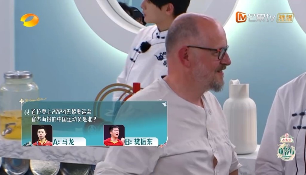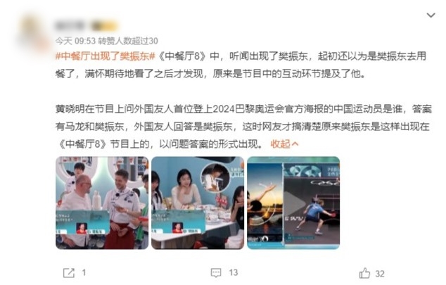 近日内地综艺节目《中餐厅》第8季的片段中,出现“乒乓球世界冠军樊振东”,黄晓明问:“首位登上2024巴黎奥运会官方海报的中国运动员是谁?”由外籍厨师读出两个选择马龙、樊振东,虽然是由外籍人士回答,但普通话发音相当标准,而且答中樊振东,获黄晓明举起手指称赞。不少网民睇完影片后,在微博洗版留言,而且反应两极,有人直指节目蹭樊振东热度。