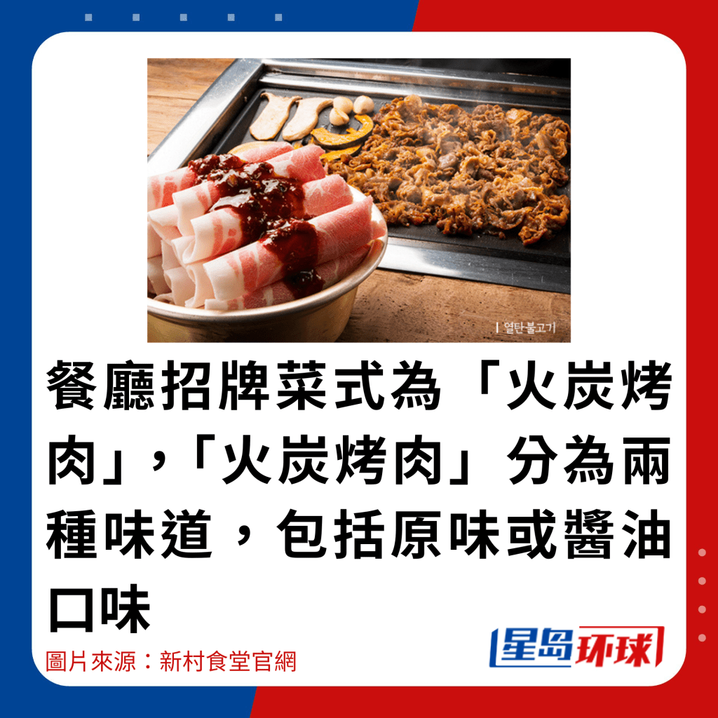 “新村食堂”是白种元旗下的烤肉餐厅品牌,以平价及高品质的烤肉而闻名。餐厅招牌菜式为“火炭烤肉”,“火炭烤肉”分为两种味道,包括原味或酱油口味。薄猪肉片以韩式辣椒酱等材料制作甜辣汁,经炭火烤熟后更能保留肉汁鲜味。表面微焦的肉片,肉质嫩滑又多汁,可配白饭或生菜包肉一同享用。
