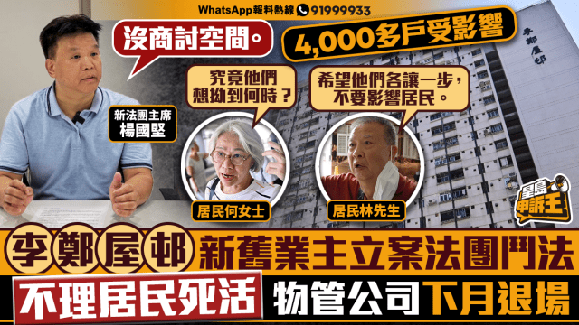 深水埗李郑屋邨出现新旧业主立案法团纷争,各自声称自己才是合法法团,事件扰攘近9个月仍未解决,银行冻结了法团户口,令到屋邨很多维修工程停了下来,物业管理公司被拖逾600万元管理费,决定9月1日离场,严重影响屋邨运作。而关注事件的民政署一直努力斡旋,不停联系管理公司、中电、水务署和清洁公司等,确保邨内服务可以维持,同时亦安排新旧法团主席会面,但可惜新主席两次拒绝出席会议,而旧主席亦表示与新法团“无偈倾”,两边都未有理会4,000多户居民死活。