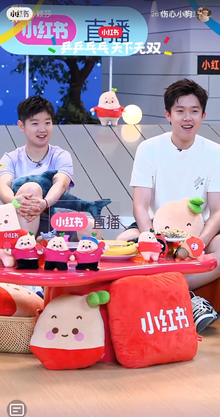 孙颖莎与同样参加3个项目的王楚钦同场,她教练邱贻可及混双教练肖战4人,上前国乒好手刘诗雯主持的节目,更一度冲上热搜第一位。两位退役球员邱贻可及肖战更被翻出以往比赛片段,获大赞靓仔,可惜当教练后却大幅走样。孙颖莎与王楚钦在今届奥运先夺混双金牌,两人自小合作,2017年的亚洲青少年锦标赛已搭档,场内场外默契十足,他们在节目中也展现比赛以外的另一面。孙颖莎笑“大头”王楚钦头大还爱哭,王楚钦也自爆2019年军训的时候,要最大号的帽子也有点紧,谈到爱哭时,孙颖莎即抢答指他小时候才爱哭,可见两人非常熟识对方,孙颖莎又笑指王楚钦打不好时,会经常向对方翻白眼。