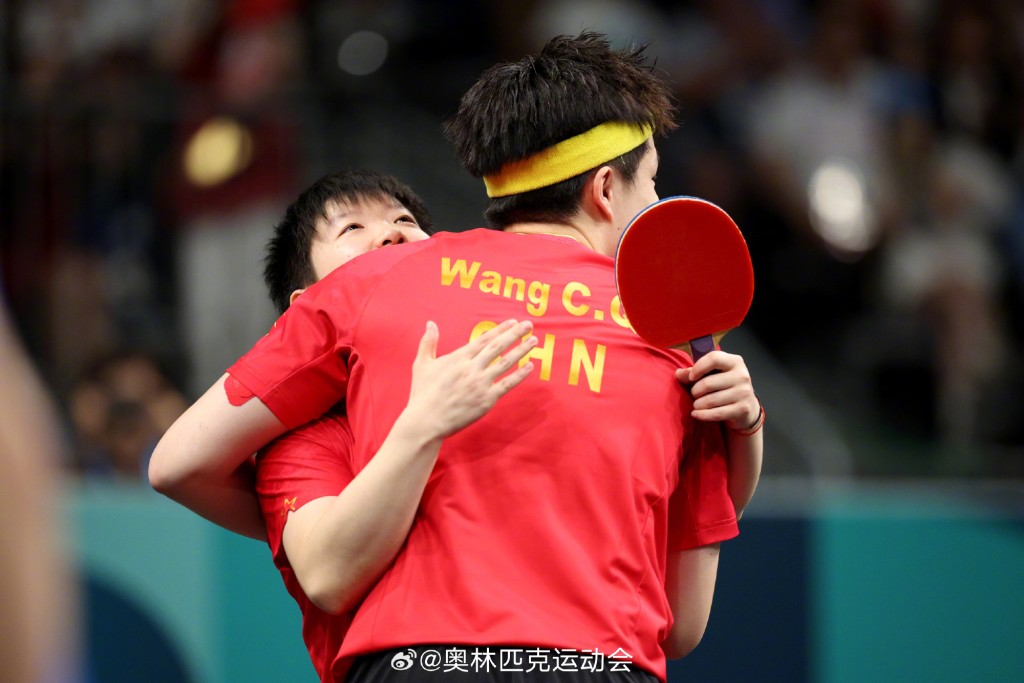 ▲孙颖莎与拍档王楚钦在乒乓混双打出好成绩,开心抱抱。微博@奥林匹克运动会