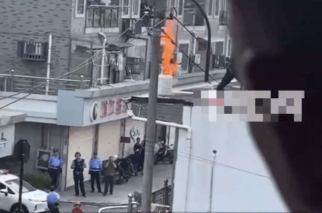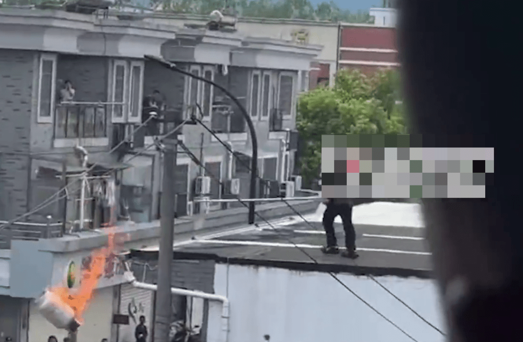 现场影片显示,该逃犯持刀在楼上与下方警员对峙,并在天台掷下燃点的石油气罐和杂物。