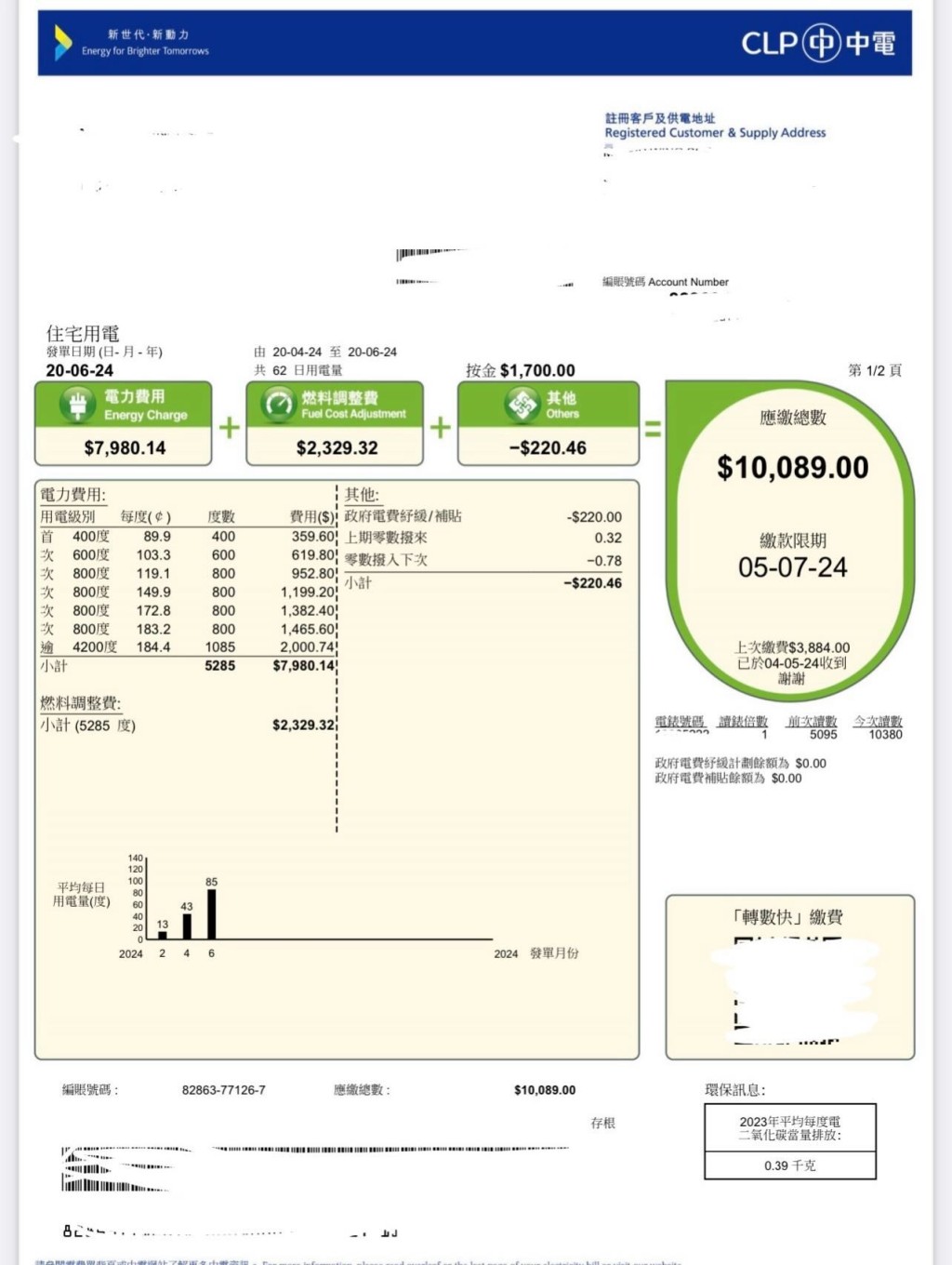 ▲近日却有港人在社交平台称,因一原因自己于6月竟要付高达10K电费(10,000港元)