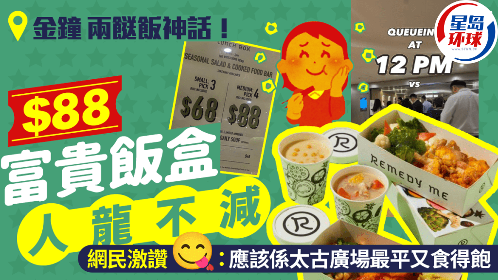 两餸饭热潮继续成为网民热话,更由平民美食逐渐“升级”成为白领恩物,部分更进军至一线商场,惹来网民热议。近日,有网民在社交平台分享位于金钟太古广场的两餸饭店“Remedy Me”,该店提供的$68三餸饭及$88四餸饭,由价格到餐厅地点俱引发网民的广泛讨论。