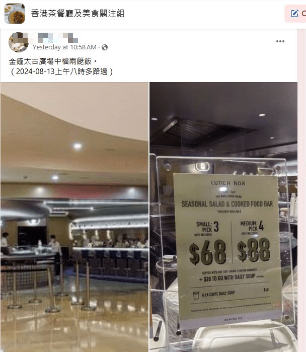 ▲近日有网民在社交平台分享了金钟太古广场开设的一家中档两餸饭店“Remedy Me”。