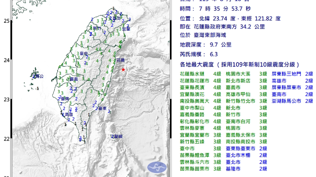 上午7点35分东部海域发生规模6.3地震,震央位于花莲县政府东南方34.2公里,深度仅10公里,属于极浅层地震,最大震度在花莲、台东、宜兰、南投、台中、嘉义、彰化、云林4级,新竹、苗栗、桃园、台北、新北、台南、高雄3级,屏东、澎湖2级。
