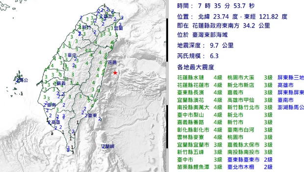 ▲上午7点35分东部海域发生规模6.3有感地震,最大震度4级。(台湾气象署提供)