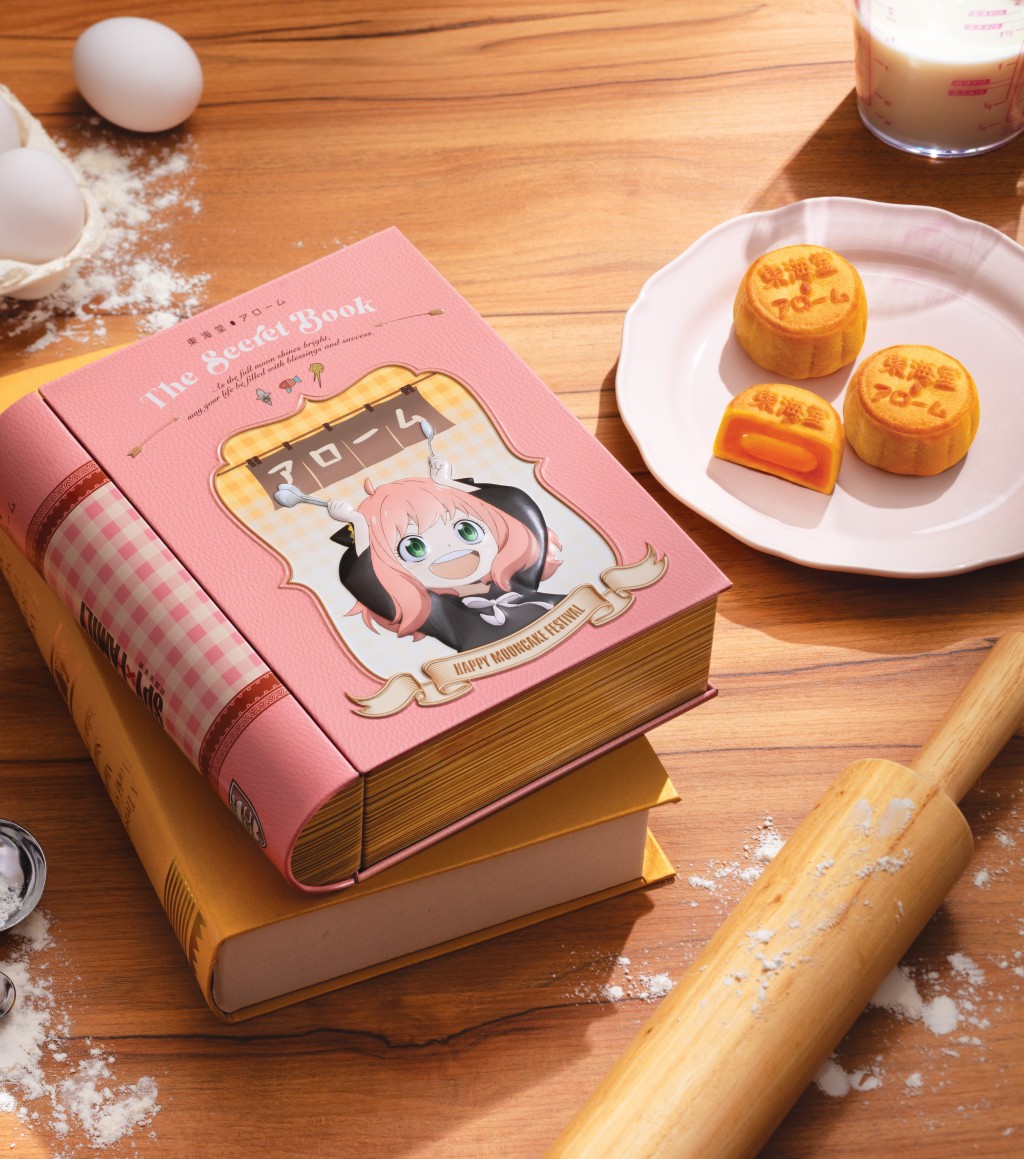 ▲间谍家家酒月饼礼盒,粉红色皮纹设计的礼盒印有安妮亚,美味的流心奶黄月饼就隐藏在书籍里面。($162 盒 东海堂)