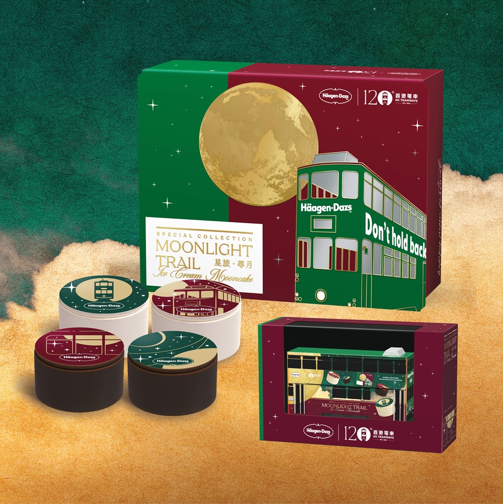 ▲星旅.寻月月饼礼盒,特别版礼盒附送1比120的电车模型,备有士多啤梨、比利时朱古力、云呢嗱及焦糖脆饼雪糕月饼。($438 Häagen-Dazs)