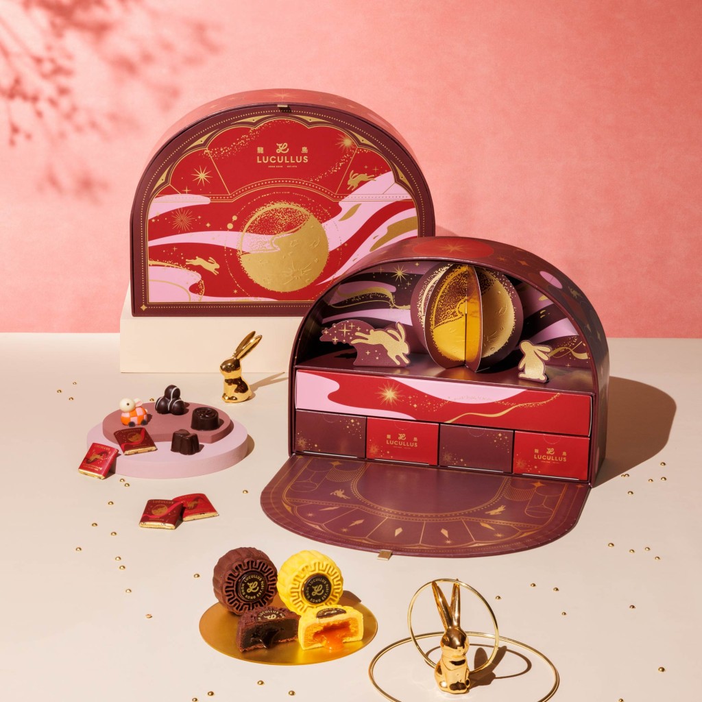 ▲朗月中秋月饼礼盒,半圆拱形礼盒印上烫金的应节图案,设计优雅,内有奶黄流心及朱古力流心月饼,以及多款手工朱古力。($408 龙岛)