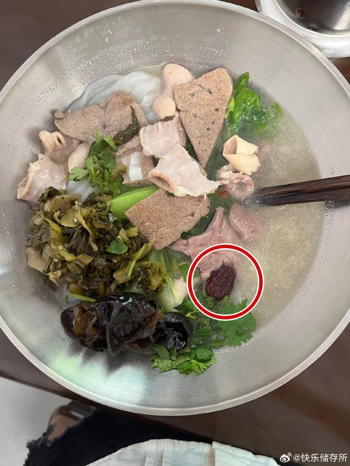 ▲网友拍下了河粉汤中有一疑似蟑螂。