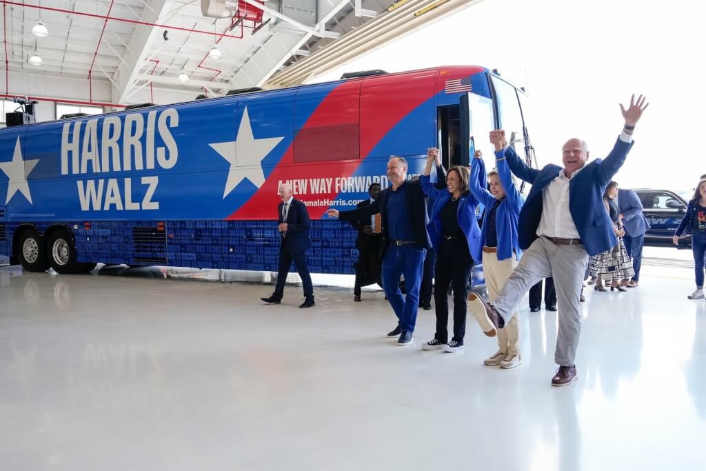 她与搭档沃尔兹(Tim Walz)在两位配偶陪伴下抵达匹兹堡(Pittsburgh)一座机场的机库,向支持着致意,然后搭乘车身写着两人名字的巴士,展开对一系列小镇的拉票行程,寻求蓝领选民支持。