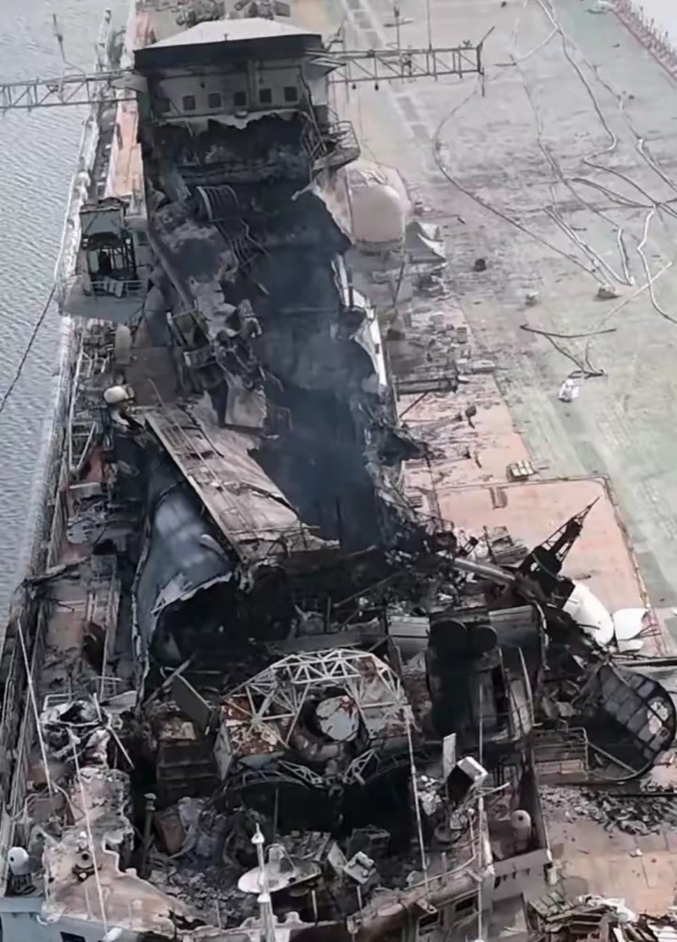 相关影片显示,一开始废旧航舰右舷舰岛下方的舷窗冒出浓烟,入夜后火势逐渐向上蔓延,距离起初冒烟的位置已烧穿4至5层甲板,舰岛、桅杆和一部分烟囱已烧焦坍塌。南通市民17日在火场附近拍摄的影片显示,火势已被扑灭,但航舰舰岛上的雷达和通讯设备等结构几乎毁坏殆尽,3层航海舰桥已荡然无存。影片显示,航舰甲板上仍有许多工作人员,疑似在处理火灾后续工作,并在航舰停靠处的岸边搭建临时帐篷。