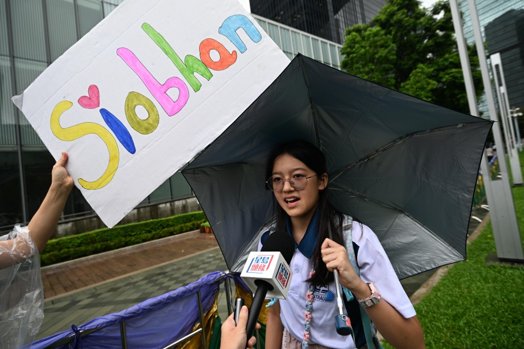 ▲11岁的Alice今日特意举著“Siobhan”牌子在添马公园等候。