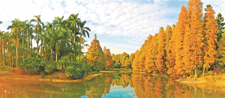 一边是四季常绿的棕榈植物,椰风葵林一派热带风情;另一边是依水而生的落羽杉,春来嫩绿,入夏青葱,秋时棕红,冬来飘落。1986年,华南植物园这一最具代表性的景点龙洞琪林入选羊城八景,一时传为佳话。如今的华南国家植物园四时不同,成了永不落幕的“万国奇树博览会”。中外植物荟萃于此,也呈现了广州开放包容的气质。
