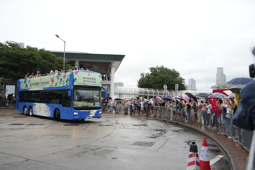 巴士于11时抵达尖沙咀钟楼,巴士经红隧过海后抵达湾仔一带,到达金钟太古广场(PP)时,有市民在天桥上挥手,运动员也挥手挥旗和应。 巴士于11时25分抵达中环码头,大批市民在码头及天桥上热情欢呼,江旻憓以飞吻回应。 巴士抵达立法会综合大楼,步行到终点添马公园。