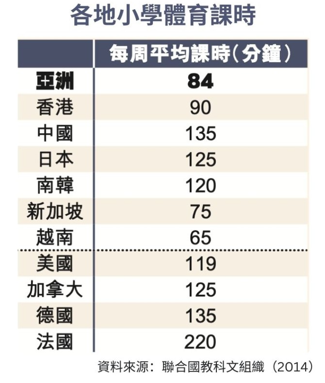 对比之下,多个地方的体育课标准课时皆远超香港。 早在10年前,联合国教科文组织发布了一份国际性研究,揭示香港小学生每周的平均体育课时只有90分钟,稍微高于亚洲整体课时约84分钟,但仍然比邻近的日本(125分钟)、韩国(120分钟)及内地(105分钟)少,对比部分欧美国家的差距更大(见表)。