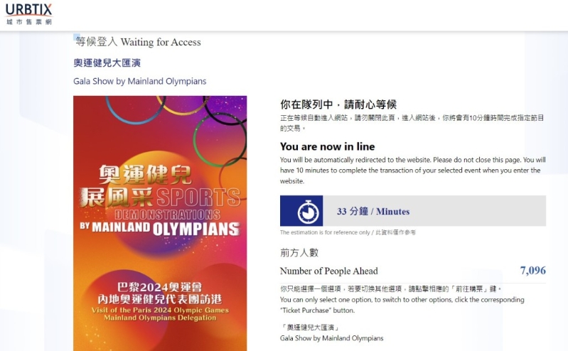 巴黎奥运国家队代表团将于本月29日至31日访港,其间出席大汇演及进行运动项目示范,门票今早(22日)10时起公开发售,每张20元。《星岛头条》记者上午10时正准时进入城市售票网,惟在“秒㩒”的情况下,3场活动分别需轮候33分钟至85分钟,“跳水及游泳”、“羽毛球、体操及乒乓球”示范有逾1.8万人在轮候,至于“奥运健儿大汇演”则有逾7,000人轮候。
