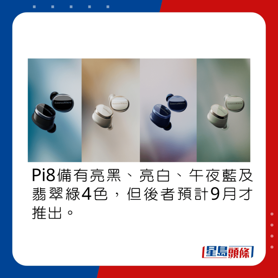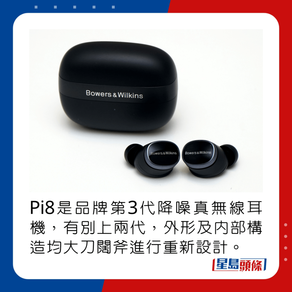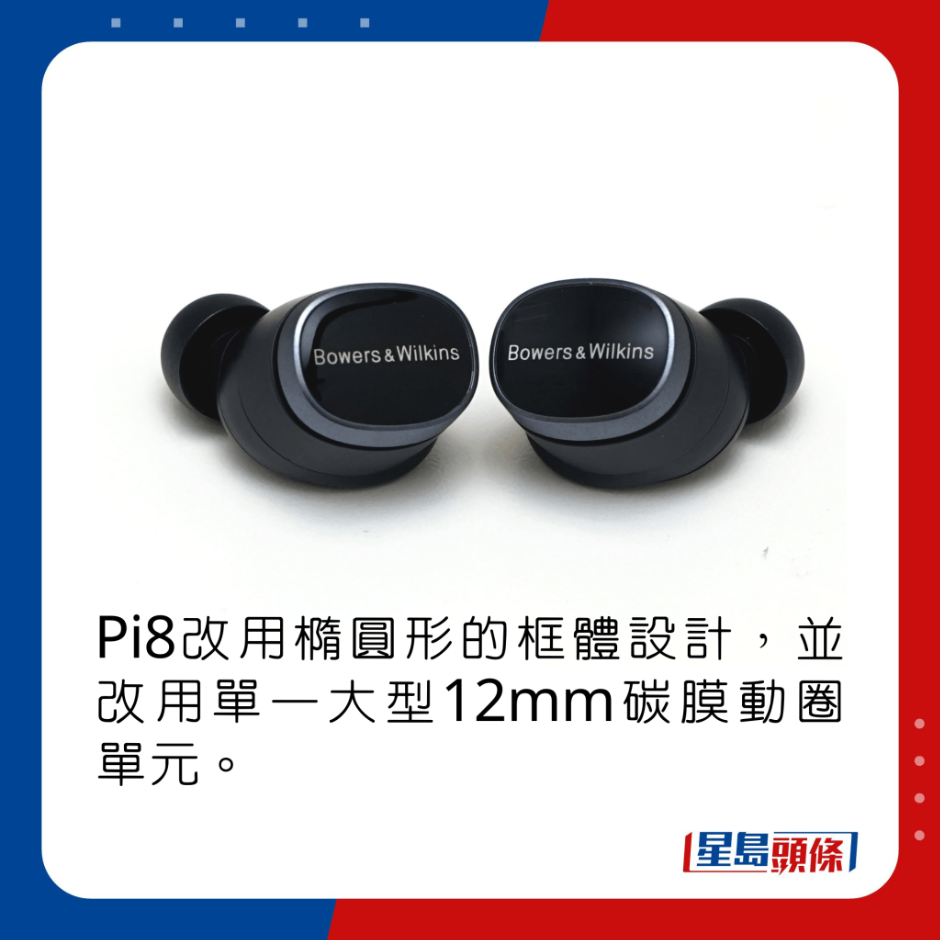 过去3年,B&W先后推出过PI5、PI7、Pi5 S2及Pi7 S2共4款降噪真无线耳机,来到今日试玩的新旗舰Pi8,已经进化至第3代,基本上由外形、内部构造以至驱动单元都经过革新。先是耳机换上椭圆形框体,配以抛光触控面板,表面印有品牌字样,同时加入金属色环包边,感觉更高贵典雅,且有亮黑、亮白、午夜蓝及翡翠绿4色选择。