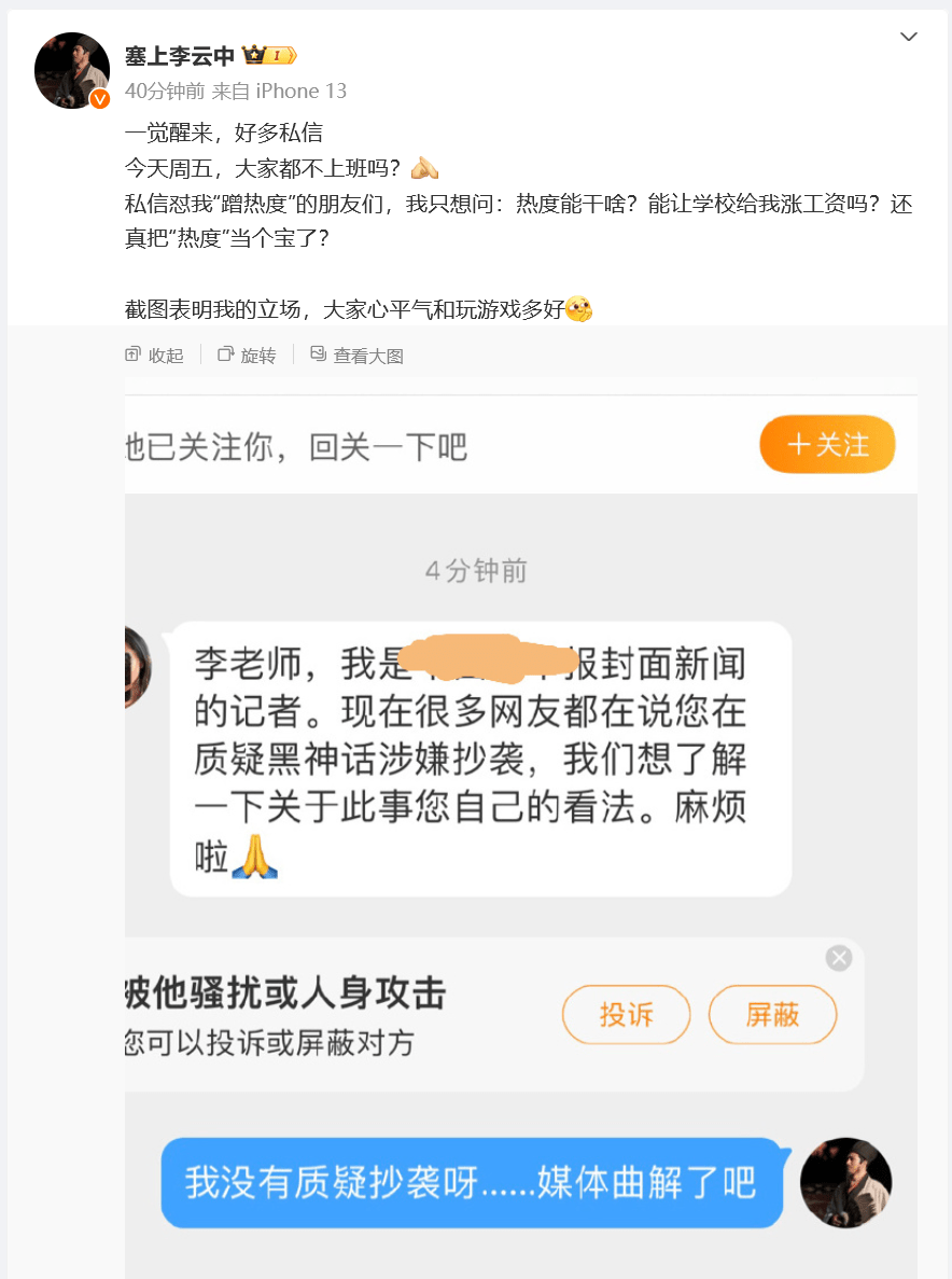 不过,“塞上李云中”后续强调,自己并非是在质疑《黑神话:悟空》抄袭,并称自己无意“蹭热度”。但他认为“我发现《黑神话》有借鉴我作品的几处证据。”