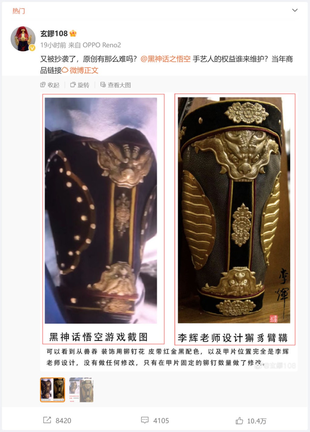 在22日晚,微博用户“玄镠108”发布微博,贴出《黑神话:悟空》杨戬的臂鞲与其过往设计的臂鞲作品的对比图,感叹“又被抄袭了,原创有那么难吗?”