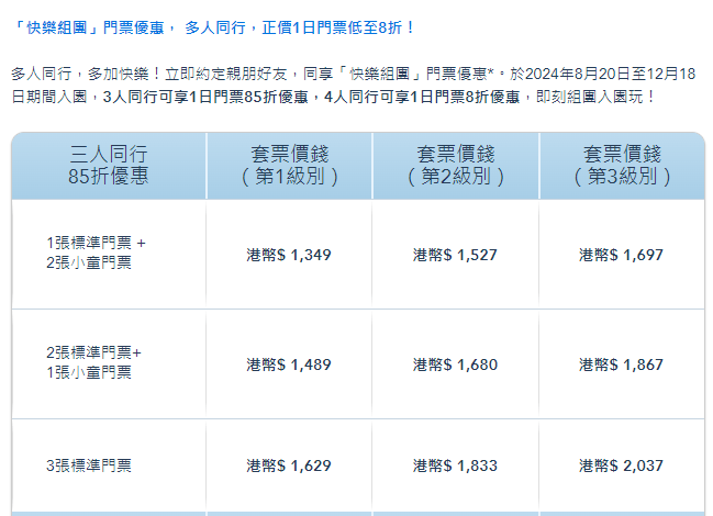 3人同行可享一日门票85折优惠(第1级别至第3级别);