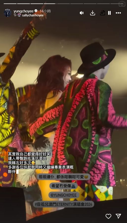 事后容祖儿都有在IG分享这次惊险意外,而且淡定笑指自己“食咗隔夜粥无事”,又指:“其实我自己都觉得好好笑,连人带声跌咗落坑渠咁,我睇咗好多次,多谢各位扶起我同时又继续专业表演嘅伙伴们 Love u(其实我自己都觉得真好笑,连人带声掉到坑渠,我看了很多次,谢谢各位扶起我同时又继续专业表演的伙伴们Love u)”!Fans就大讚容祖儿跌倒都又靓又可爱,并希望她没有大碍。对于昨晚容祖儿于演唱会期间,因机关问题跌倒,险些发生意外,其经理人霍汶希Mani回应:“好彩祖儿反应快,最后冇事,台下所有同事都吓亲。”