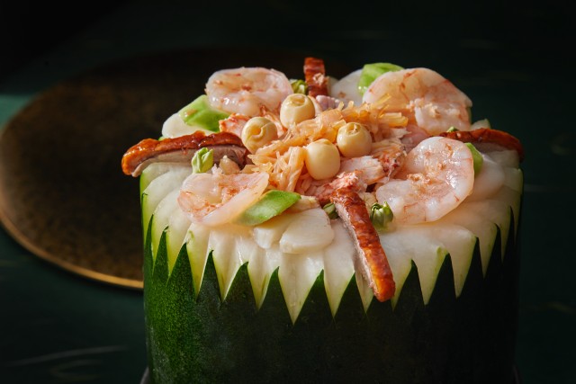 尖沙咀国金轩The Mira是米其林推荐当代粤菜食府,以巧手粤菜工艺闻名。中秋节前夕推出了三款合时汤品,“原只鲜蟹钳锦绣冬瓜盅”(每位 $398,须提前24小时预订)消暑解热,以原个冬瓜盛载田鸡、鸡肾、老鸡、赤肉及金华火腿等,佐以原只肉蟹钳蒸炖足足6小时,滋味丰富。另一款“原个椰皇松茸花胶炖竹丝鸡汤”(每位 $368)则以原个泰国椰皇盛载竹丝鸡及龙岗鸡,配上花胶及松茸,补而不燥、既滋阴清热又养颜。