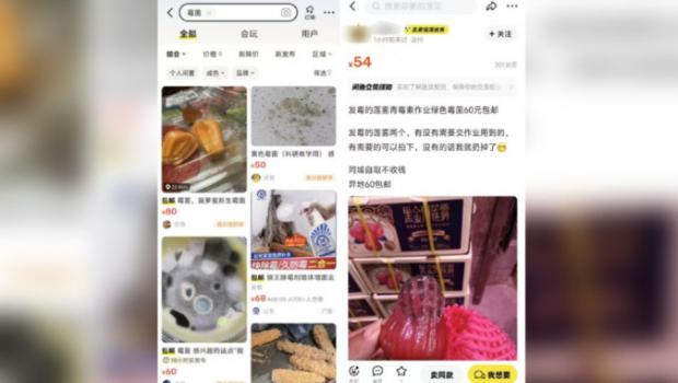 在闲鱼上搜寻霉菌关键词,便会出现许多“酒瓶里长的霉菌”、“橘子霉菌”、“酸奶霉菌”、“茶叶霉菌”、“饭上的霉菌,上等,纯正”等等结果,并注明“有搞实验的感兴趣吗?”、“随机拯救一位科研人”等作招徕,标价由数十到数百元人民币不等。