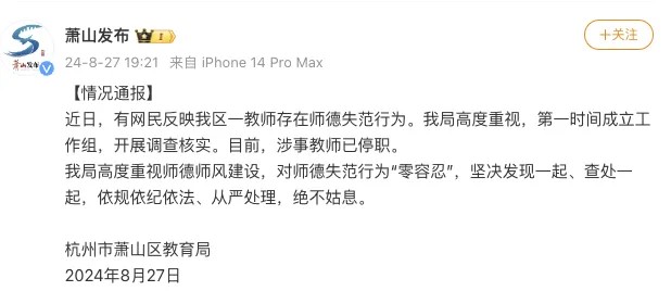 据杭州市萧山区教育局27日通报,近日,有网民反映萧山区一教师存在师德失范行为。 教育局高度重视,第一时间成立工作组,开展调查核实。 目前,涉事教师已停职。