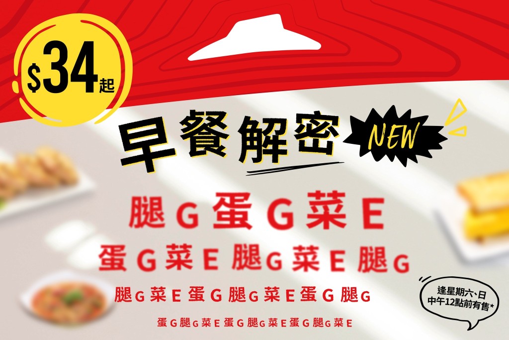 Pizza Hut 必胜客早餐全新加盟!逢星期六、日及公众假期,上午9时至中午12时即可以低至$34叹各款“滋味早餐”,最新推出的3款新选择更包括港式厚蛋三文治、烘火腿芝士吐司(半份)配炒/煎蛋及烟肉/火腿及意大利蔬菜汤意粉配炒/煎蛋及烟肉/火腿。