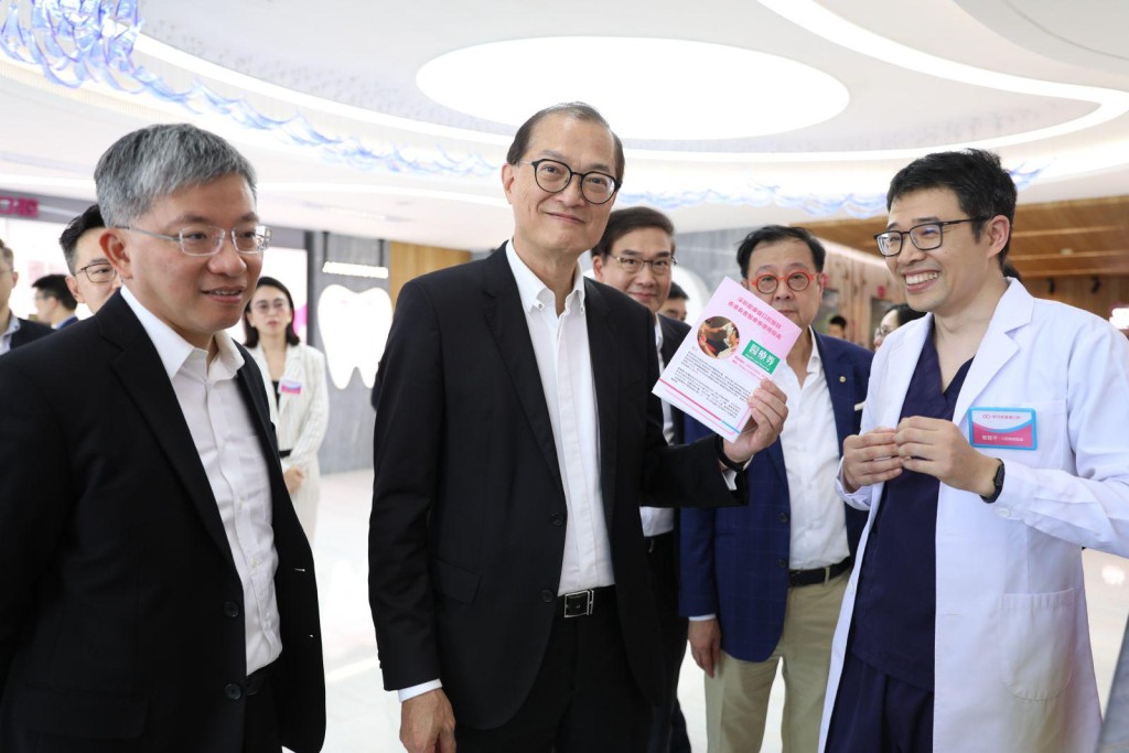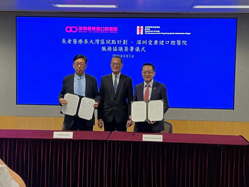 ▲医务卫生局局长卢宠茂见证与5间医疗机构代表签署服务协议。