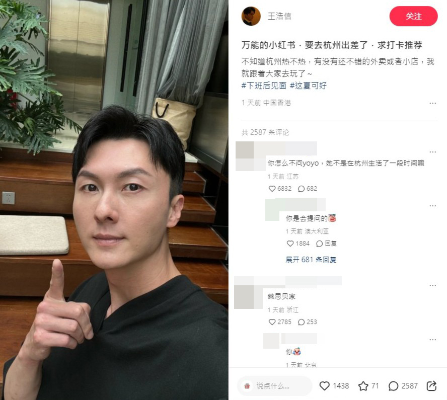 ▲日前王浩信于小红书发文指自己身在杭州求打卡推荐,却被网民回:“你怎么不问Yoyo,她不是在杭州生活了一段时间嘛”。