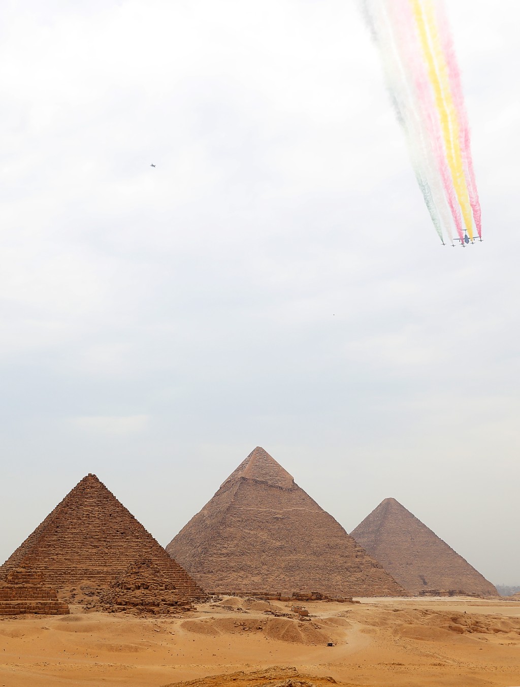 中国空军“八一飞行表演队”应埃及空军邀请参加首届埃及航展,参展的1架运-20与6架歼-10C表演机编队,当地时间28日中午飞越金字塔,这也是运-20首次在国外飞行表演,歼-10表演机在空中拉出象征中埃两国国旗颜色的6道彩烟,在吉萨金字塔景区的旅客争相合影留念。