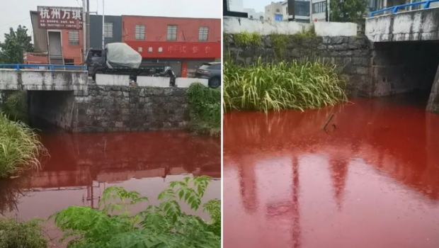 8月28日下午,有杭州网民称,萧山区瓜沥镇渔庄村一河段疑似遭到污染,河水颜色呈现鲜艳的红色。