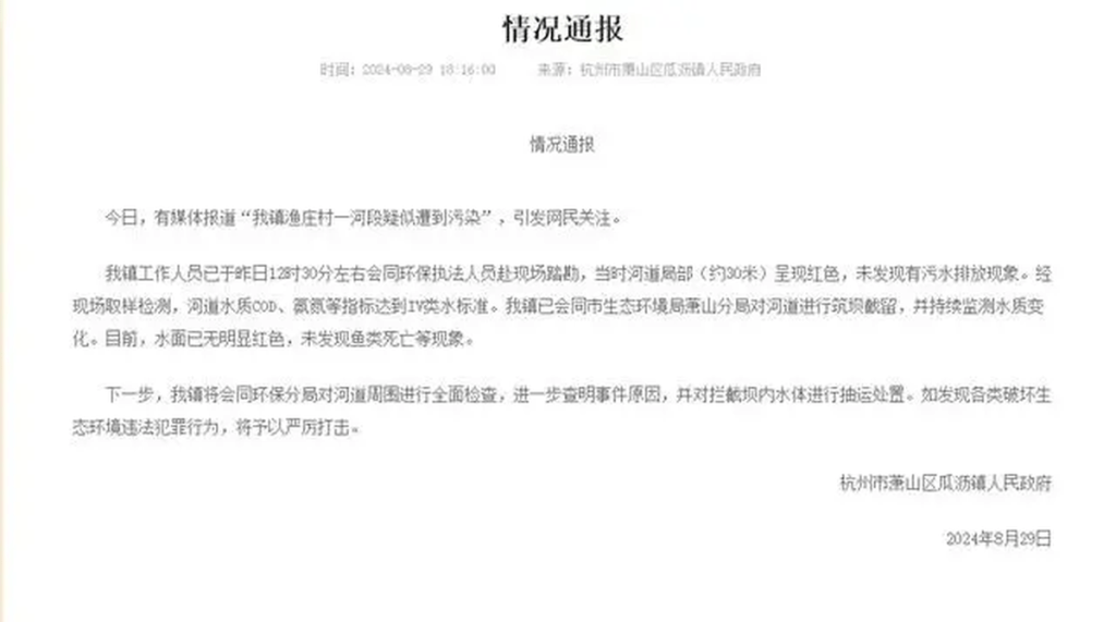 杭州市萧山区瓜沥镇人民政府29日晚发出情况通报,称未发现有污水排放现象,已对河道进行筑坝截留,并持续监测水质变化。